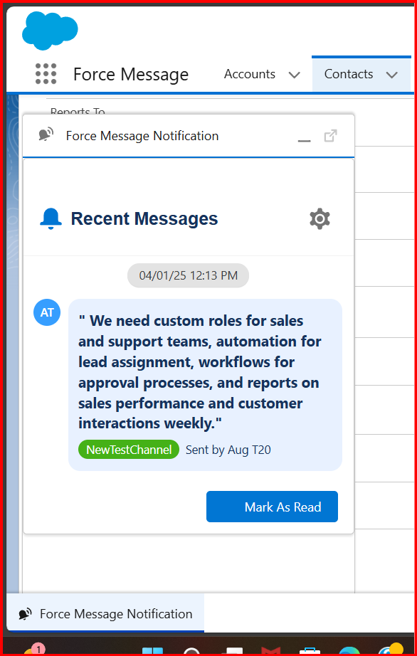 Once the admin/power/normal user reads the message, they can click Mark as read. Clicking on this button, the message gets stored in All Messages in the Force message Inbox Component.