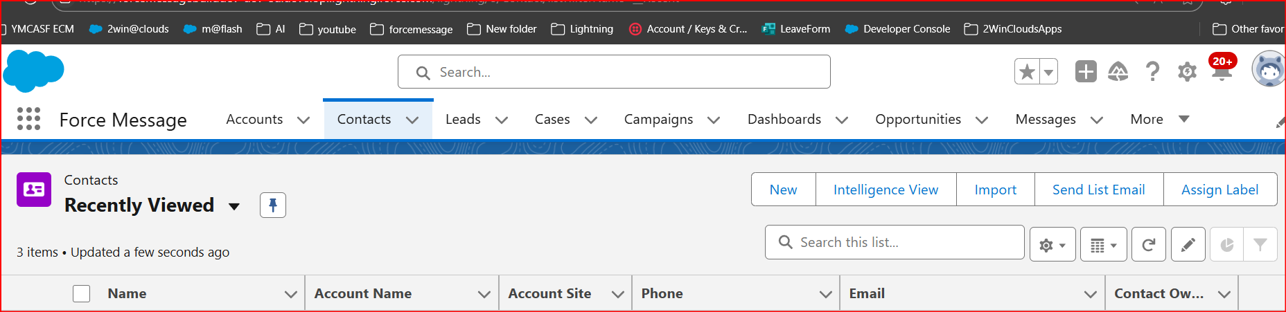 - Tabs: Accounts, Bulk UI, Cases, Campaigns, Messages, Message Channel, Message Template, Message Channel Users, Opportunities.
