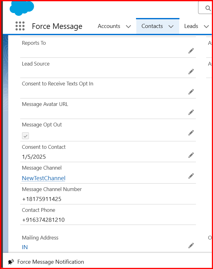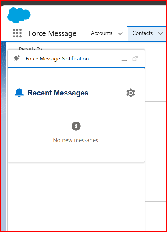 Once the above field is != null. Then, to that contact phone number, the below message is sent to this message: If that contact type is only start, irrespective of any case, then only whatever they send to admin/power/normal user will receive the message. If we get messages from contact, then that is called an incoming message. If any incoming messages are received as admin/power/normal user, the bottom of the screen will show the Force Message Notification Utility bar. Clicking on that, you can see a settings icon. Clicking on that, you can see a few settings.