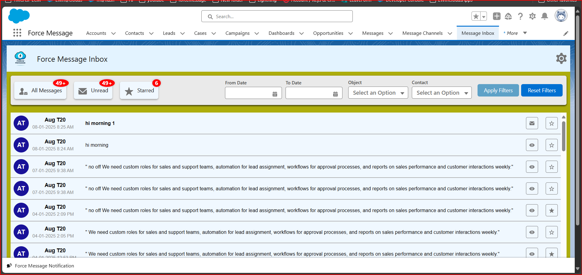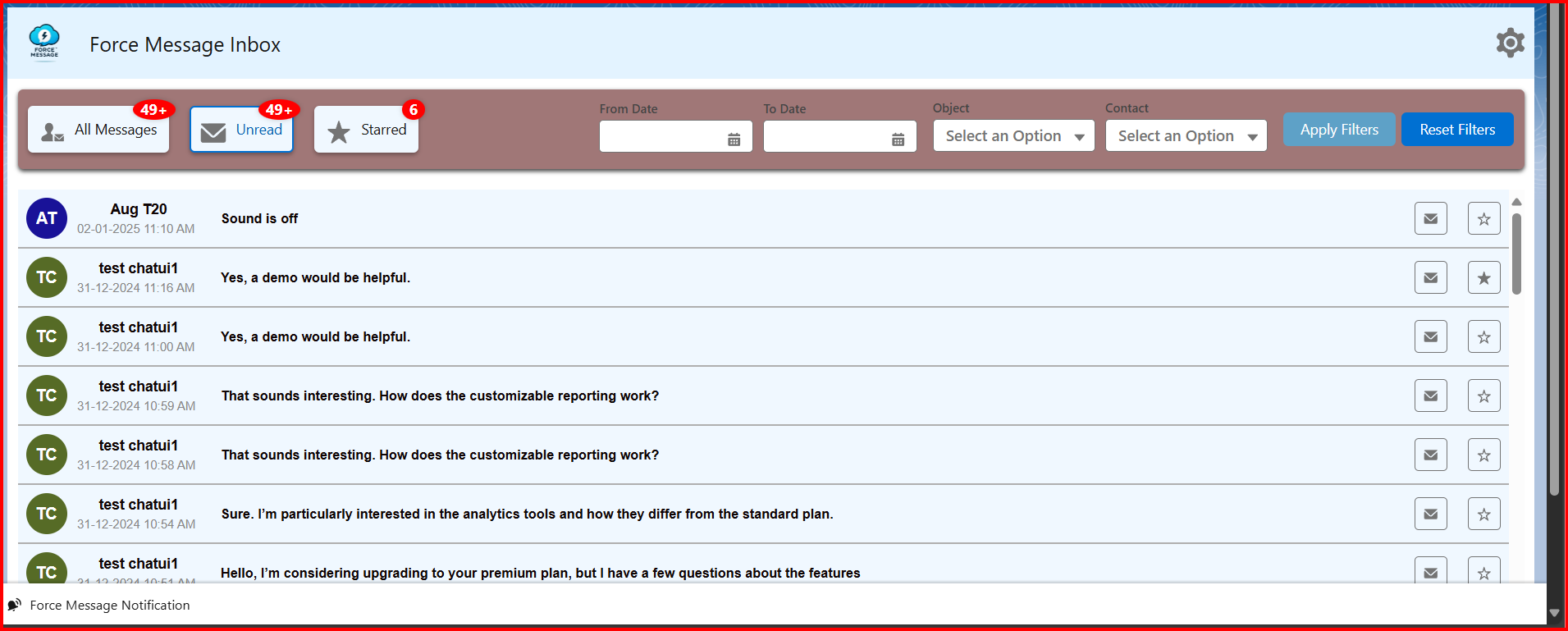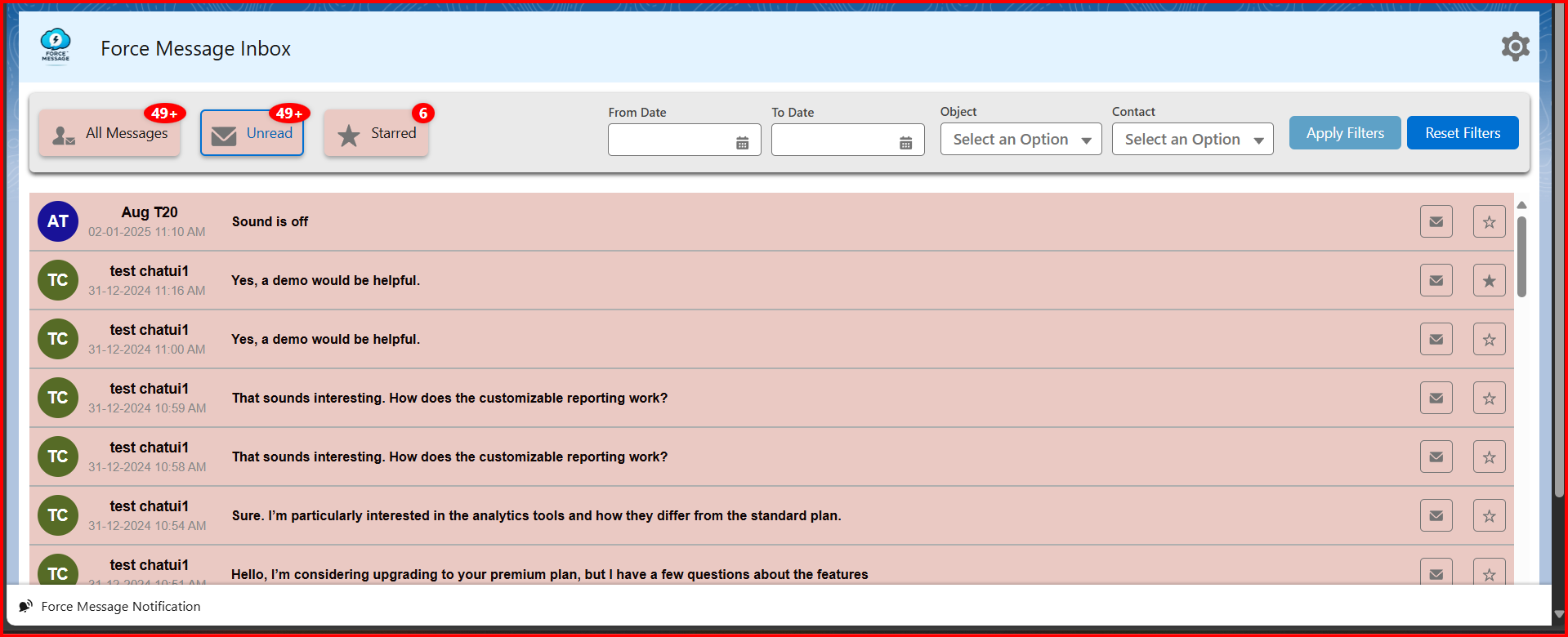 3. All the incoming messages that are read or in notifications clicked as Mark as Read by the user display in the All Messages option, which are unread by users or in notifications not clicked as Mark as Read, or if Notifications or NewTestChannel in Notification settings is disabled, then that particular message gets stored in All Messages and unread messages in the Force message component.